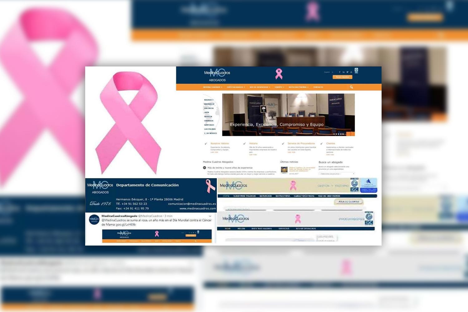 Durante todo el día de hoy, las firmas de los correos electrónicos de toda la plantilla de la compañía van a lucir un lazo rosa como muestra de apoyo y colaboración con estas mujeres y las páginas Web de Medina Cuadros Abogados, Gestión de Recobro y Procuradores cuentan con un lazo rosa que destaca en la parte superior para conmemorar el Día Mundial en la lucha Contra el Cáncer de Mama.